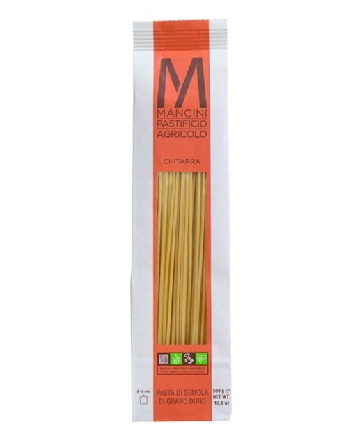 Opisywany jako „makaron wstążkowy”, Spaghetti Chitarra firmy Mancini ma długość 260 mm i kwadratowy przekrój 2 mm z każdej strony.